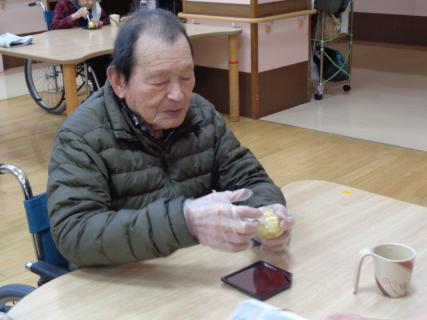 ボウルにいれて入居者様がフルーツをまぜていきます!